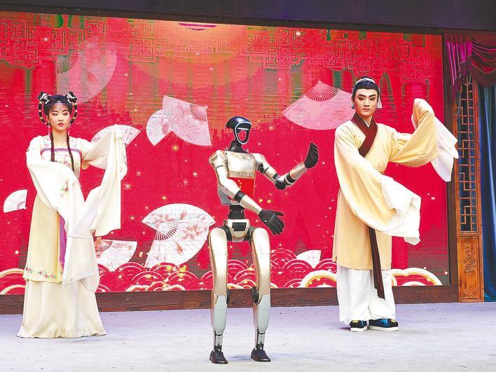 在黄梅县东山(Dongshan)的Wenmei村的情况下,智能机器人在与黄史学歌剧院(Huangmei Opera)的演员相同的情况下,制作了黄梅(Huangmei)歌剧。 (Xiong Danna的照片,Hubei Daily Nerverment)