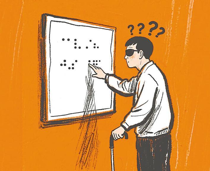 漫画/杜宇辉 日前,有网友发布视频指出,高铁标志上方便残疾人使用的盲文字母似乎没有凸起,对于依靠触觉识别字母的视障人士来说毫无用处。从施工到验收,没有人注意到常识性错误,反映出相关人员缺乏责任感和同理心。无障碍设施不是障碍。经过认证的盲文装置可以为视障人士提供更多独立行动的可能性,也可以表达对视障人士真正的尊重。 (文/刘中阳)