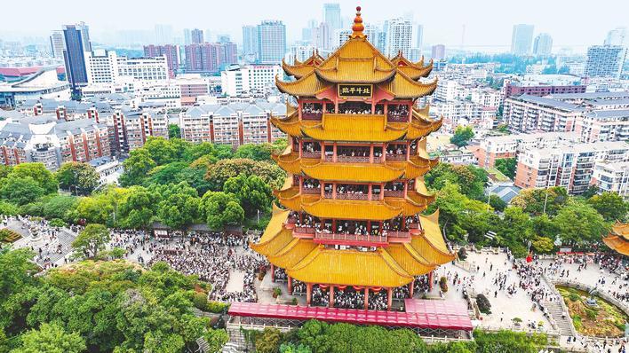 根据Tongcheng Travel平台的数据,Huanghe Tower是该国第一天最受欢迎的地方的决赛。国庆假期。黄色的起重机塔升到蛇山的顶部,充满了庆祝欢乐。